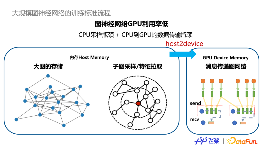 相比于一些大模型,在图网络里面大部分的消耗反而是在图的存储以及特征的拉取上面。比起刚刚说到的一些大模型参数量上,目前模型在纯网络的模块是会比较小的,但即使在这种情况下,我们的图神经网络训练的 GPU 利用率还是很低的。最大的瓶颈就在于 CPU 上图的采样的瓶颈,以及我们从 CPU 到 GPU 的数据传输的瓶颈。因为我们的图很大,所以通常情况下 GPU 是存不下来的。我们会把图和一些采样的算法实现在内存,最后采样完之后,我们再把它挪到我们的 GPU 去做计算。
