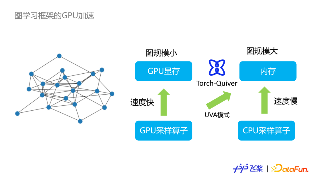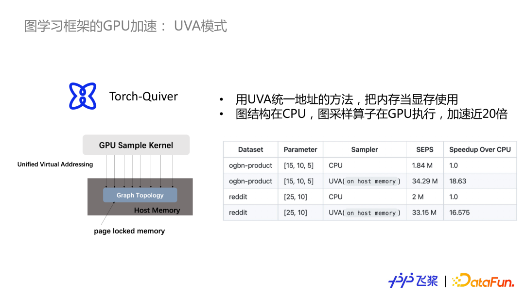 一个折中的办法就是我们能不能用 GPU 采样的算子访问内存的图数据,做到大图的扩展。这个工作是 2021 年,大概六七月份的时候有个叫 Torch-Quiver 的团队他们做了一个事情,就是把内存当做显存的一块,用一个叫做 UVA 的模式,用 GPU 的采样算子,直接对内存访问去做采样。达到的效果就是会比这纯 CPU 的采样快很多,比 GPU 显存的存储要慢一些,但是图就已经可以变得很大了。