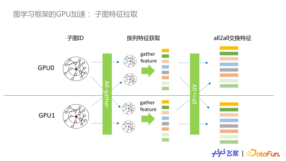 在实际的训练里面,我这里用两个 GPU 来举例子,当我们在做数据并行的时候,每个 GPU 只是负责某一部分节点的训练,采样它子图 ID 的时候,我们可以按列用一次的 All-gather,把所有的点对应的一块子图,全部通过 All-gather 获取,然后在局部的按列切分的特征上面把一些 feature 获取。获取之后再通过 All2all 去交换特征,把整个图的结构特征还原。通过这样的 All2all 把整个特征切分,用 GPU 做传输,我们目前可以把 R-GAT 在 MAG240 上面半分钟就可以训完一个 epoch 了,相比之前的相对于 CPU 的或者说 DGL 的那种也是 CPU 模式的速度会更快。