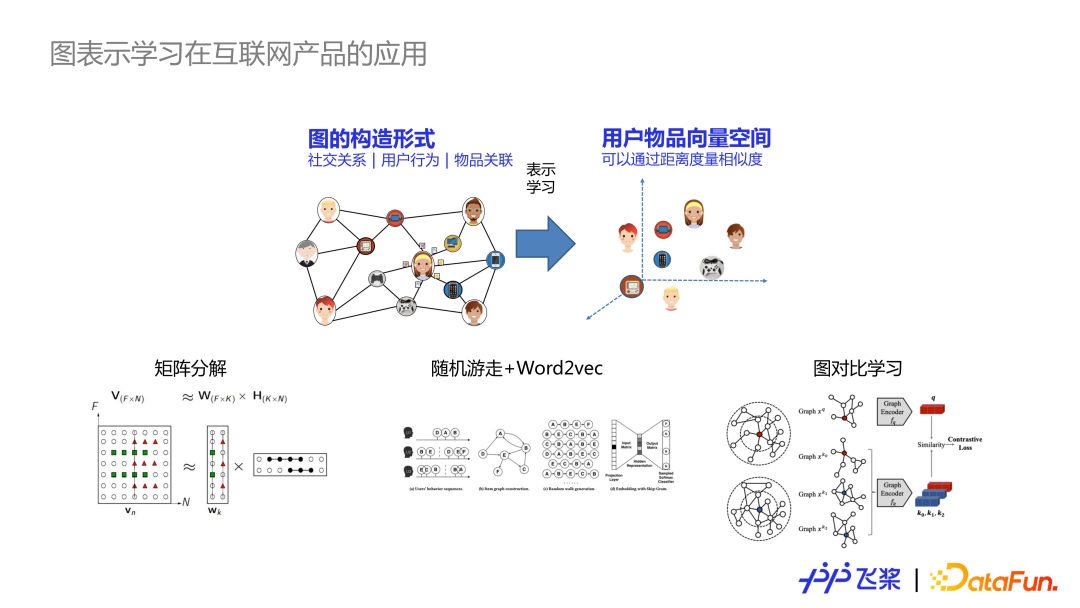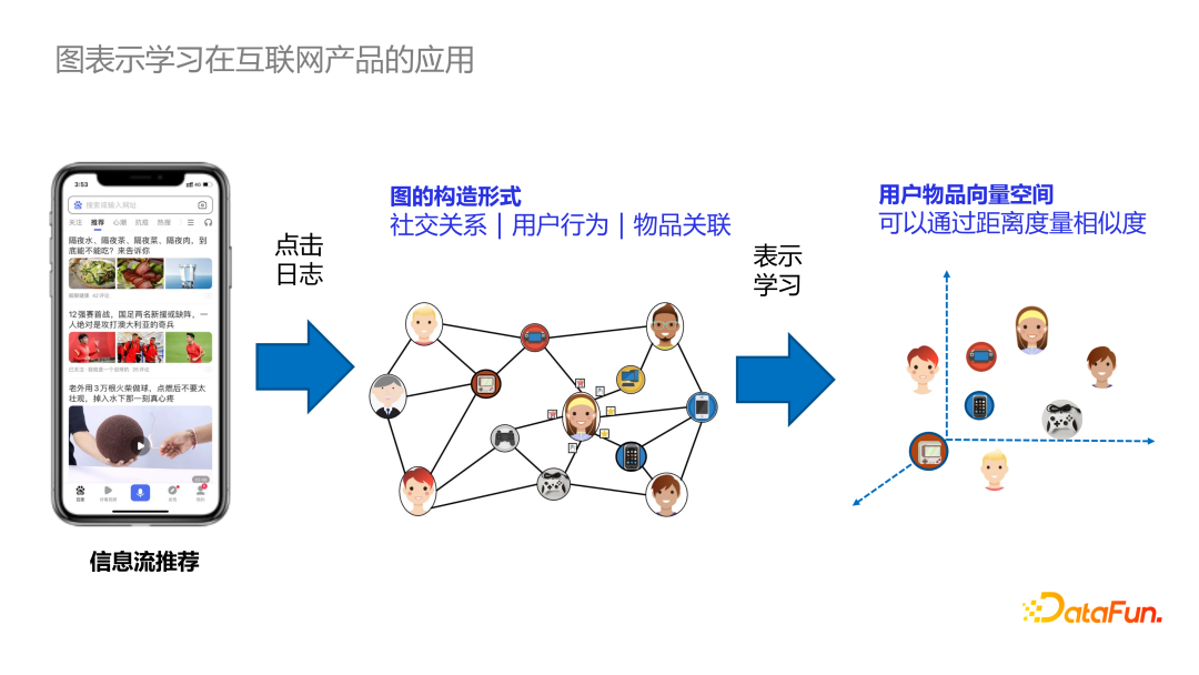 通常图学习在互联网里面的一些应用大部分都是基于这样的情况,就是我们会在海量的日志里面用户以及物品构造一张很大的图,包括有社会的关系、用户的一些行为以及物品的一些关联。我们通过这些图表示学习的一些方法对每个点给一个向量,在这个向量空间里面可以用距离去度量,就是不同的物品以及用户之间的一些相似度。