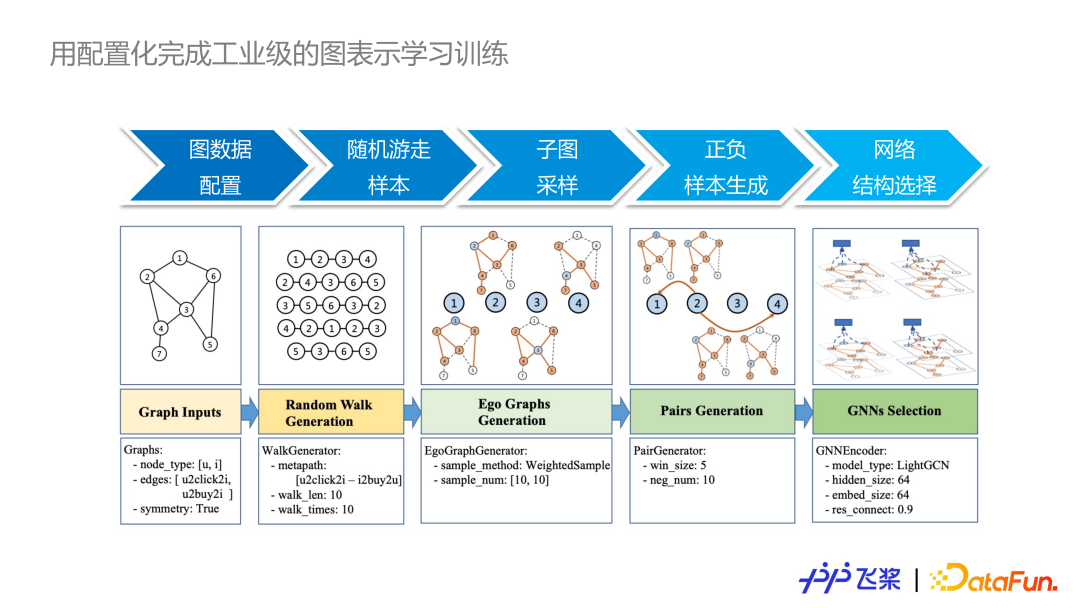 2021年,在我们 PGL 内部,我们提供了一套叫 Graph4Rec 的一个工具,可以通过五项的配置,就是配置好图数据,配置图的随机游走样本,采样的算法,正负样本采样生成的方法,以及网络选择,就能自动生成一套表示学习的训练,得到每个节点高质量的 embedding。但是之前我们这套方法是基于分布式的 CPU 去训练的。