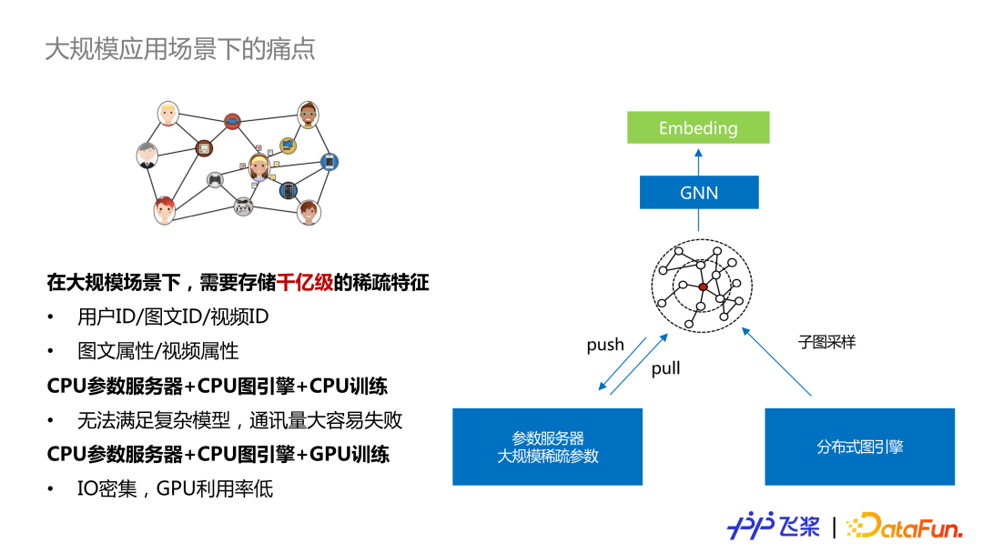 在大规模应用场景下,就出现了现在这样的一些痛点,例如我们通常会有一些千亿级的稀疏特征,包括我们用来存一些用户的 ID、图文 ID 以及一些离散化的图文视频的属性。在这种情况下,我们通常需要一套大规模参数服务器,在训练的时候要跟参数服务器进行大量 embedding 的一些查询及交互。2021年我们也还是用 CPU 参数服务器加 CPU 图引擎去配合一个 CPU 的 MPI集群做训练。它最大的问题在于现阶段不同模态的建模越来越相似,包括用 Transformer 的一些结构的话,是无法去满足一些复杂的模型的。