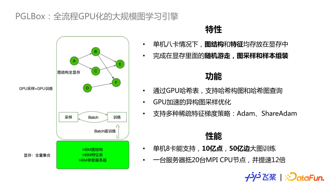 其次就是当我们的图采样邻居特别多的时候,拉取 embedding 以及图的采样的情况下,它通讯量很大。我们也经常会发现,例如我们搞 20 台机器去训练的时候,只要有一台通讯被打挂了,这个训练就很容易失败。有人也可能会说就是能不能用 CPU 参数服务器加图引擎,去配合 GPU 去训练,满足刚刚说到的一些复杂模型的需求。但是我们也会发现 IO 是很密集的,就是一些参数服务器的通讯,也是会导致整体的 GPU 利用率很低。5. PGLBox:全流程 GPU 化的大规模图学习引擎