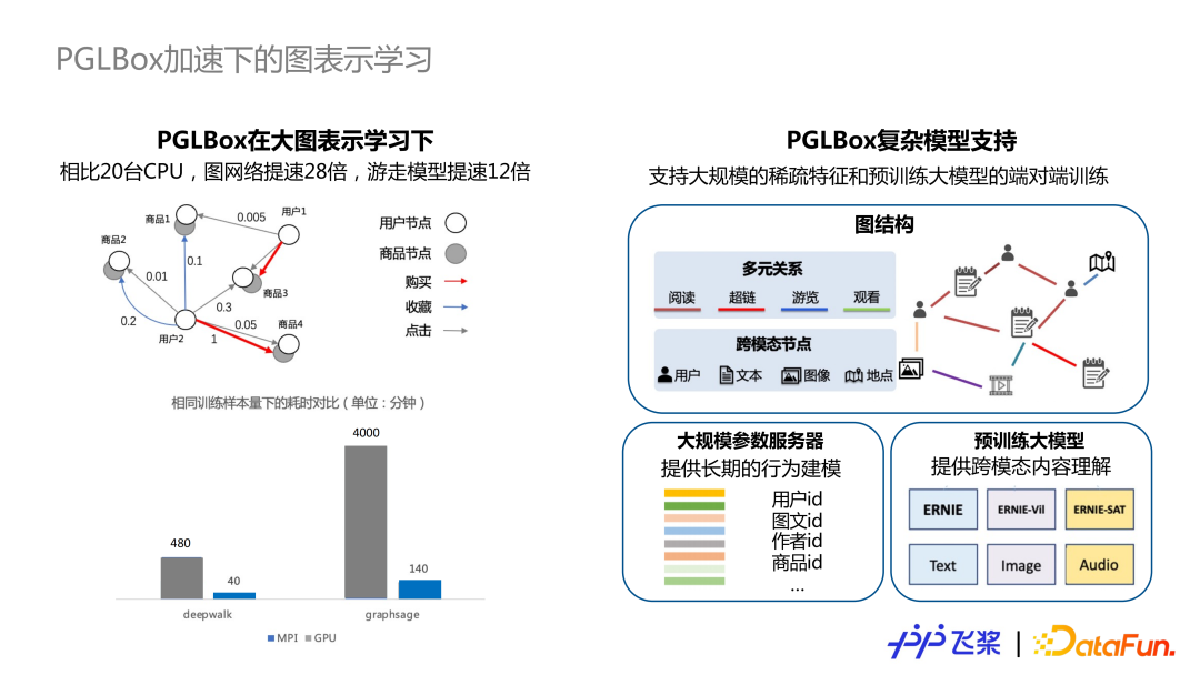 有了这么一个 PGLBox 的大图的表示学习的框架。我们在公司内也做了很多业务的升级。包括像原来有些 Deepwalk 模型,可能是 480 分钟能做完的,现在已经可以一个小时内就解决了。更复杂的模型,像 GraphSAGE 这种的就是会随着我们采样的邻居个数,导致计算量指数上涨的,在子图结构的指数上涨的同时,特征的拉取以及通信量也是在指数上升的。在 GPU 这种单机 8 卡的情况下,就基本上能把这些通讯给优化掉,像这种复杂的 GraphSAGE 一样的图网络,也能去做到 28 倍的提速。除此之外也是顺应时代潮流,我们通过这种全局 GPU 化能做到一些复杂模型的支持,像我们应用场景里面可能有不同的一些复杂关系,我们的节点本身是多模态的,里面可能有用户、文本和图像,大规模的参数服务器是提供了一些长期行为 ID 的建模,预训练模型就提供了这些跨模态内容的理解。因为有了这种 GPU 计算的图架构,我们就可以把以往预训练的大模型去跟这些大规模参数服务器放在同一套框架下面训起来,做一个端对端的学习,包括同时去调节预训练大模型里面的一些参数以及大规模的基于 ID 的一些参数服务器。通过目前这套 PGLBox 的框架,我们实现了单机 8 卡百亿级规模图表示学习训练,相比 CPU 分布式方案提升 28 倍。