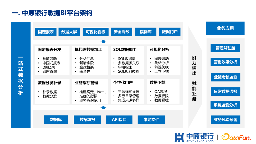 导读 本文将分享中原银行在敏捷 BI 平台上的建设实践。文中主要讲解中原银行如何从零到 1 建设整个 BI 体系。