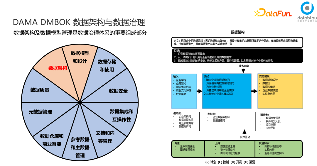数据架构及数据模型管理是数据治理体系的重要组成部分。类似于项目管理中的 PMI、PMP,国际上于 1980 年成立了 DAMA(数据资产管理协会)。DAMA 凝集了数百位专家的经验,最终形成业界通用的数据管理框架(DMBOK)。DAMA-DMBOK 数据管理框架(又称为 DAMA 车轮图),主要由 11 个知识领域构建而成,其中数据架构和数据模型是这套方法论最重要的两个维度。
