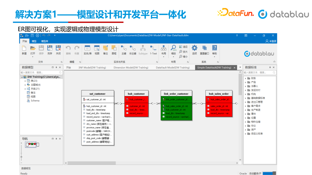 通过 ER 图可视化,可实现逻辑模型或物理模型的设计。以下图为例,数据包括 hub、link、Satellite 三个核心概念;使用 Data Vault 模型,可实现更加灵活的数仓自动化操作,以更便捷的方式实现模型的解耦,来构建复杂的、具有业务深度的行业模型。