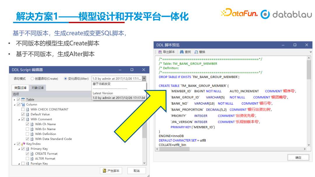 完成模型的设计后,生成相应的 DDL 脚本,通过 Create 功能或 Alter 功能,最终实现模型的管理和迭代。