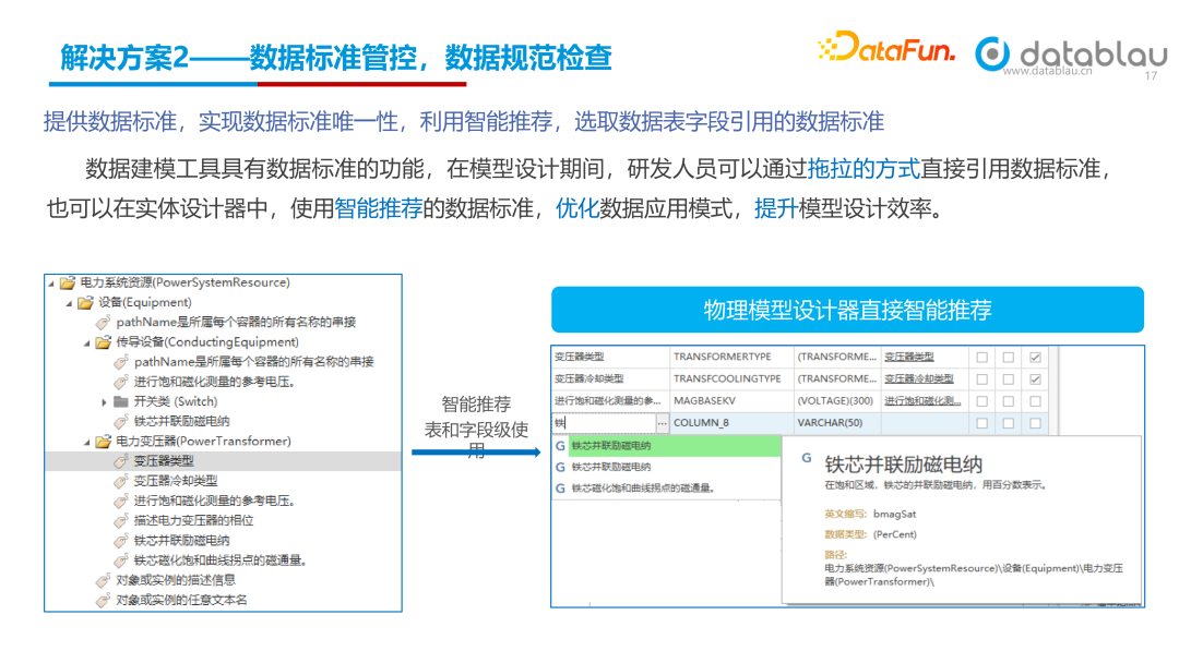 在模型设计阶段,所涉及的模型字段要实现标准化;通过指定或引用相关的企业级数据标准,利用智能推荐,更加方便地实现数据表字段的选取。