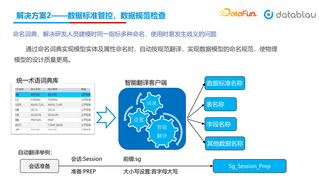 如果相关的企业或部门没有制定严格的企业数据标准,企业可以基于业务术语构建统一术语词典库(即命名词典);借助这一词典库,解决研发人员建模时常见的“同一指标多种命名”这类易发生歧义的问题;开发人员在模型构建的过程中,对于模型实体及属性命名,自动基于词典库进行翻译,实现数据模型的命名规范,使物理模型的设计质量更高。