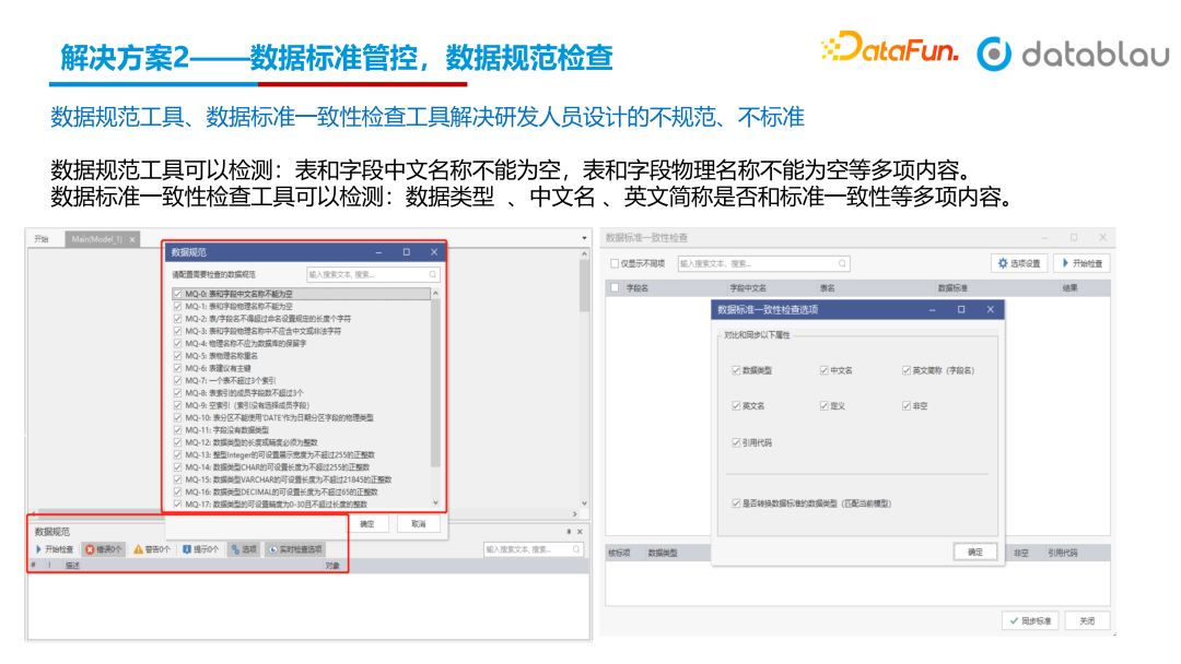 ② 数据标准一致性检查工具可以检测:数据类型、中文名、英文简称是否和标准一致性等多项内容。