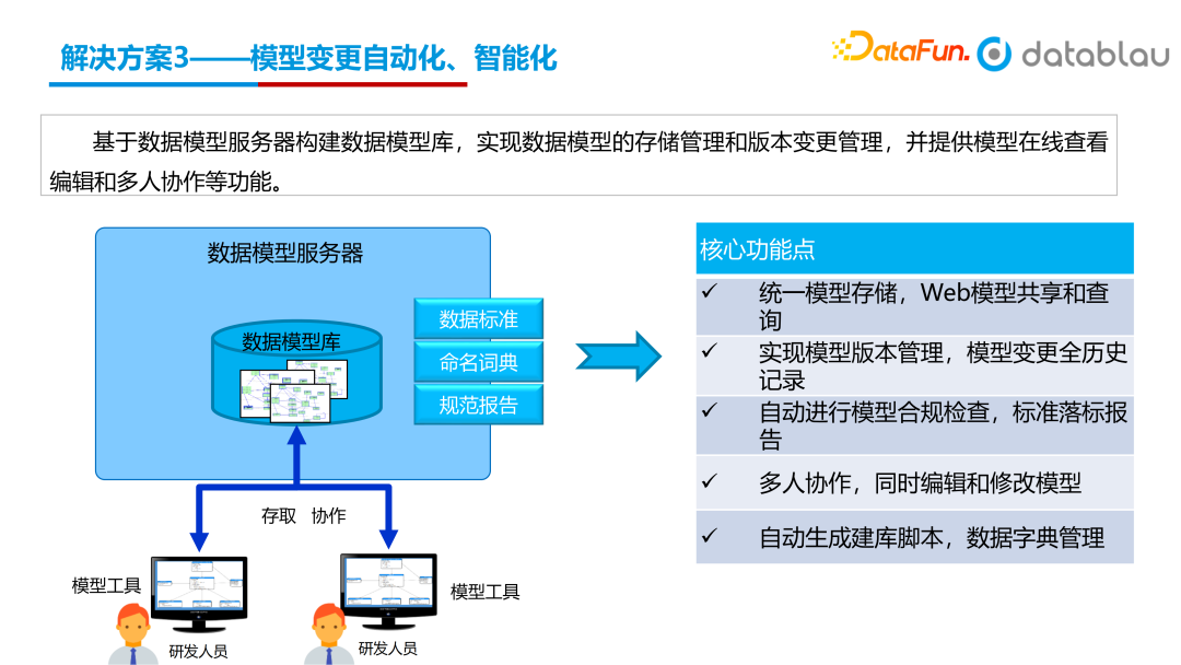 基于数据模型服务器构建数据模型库,数据库承载数据标准、命名词典、规范报告等信息;迭代优化的模型通过统一的发版系统(如 jira、confluence 等)进行统一发版,实现数据模型的存储管理和版本变更管理,并提供模型在线查看编辑和多人协作等功能。