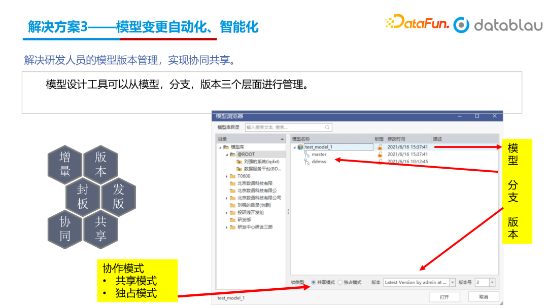 采用类似 git 的代码管理方式,模型设计工具从模型,分支,版本三个层面对模型进行管理,最终有效解决研发人员的模型版本管理,实现协同共享。