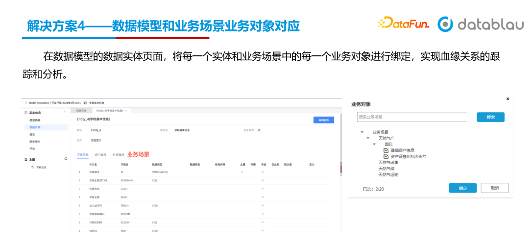 大型企业除了数据模型设计,还需要对大量的业务场景做整合。业务架构包括业务流程、业务活动等,涉及大量的业务表单和对应的业务对象。在数据模型的数据实体页面,将每一个实体和业务场景中的每一个业务对象进行绑定,进而通过 Datablau 自研的模型管控体系实现血缘关系的跟踪和分析。