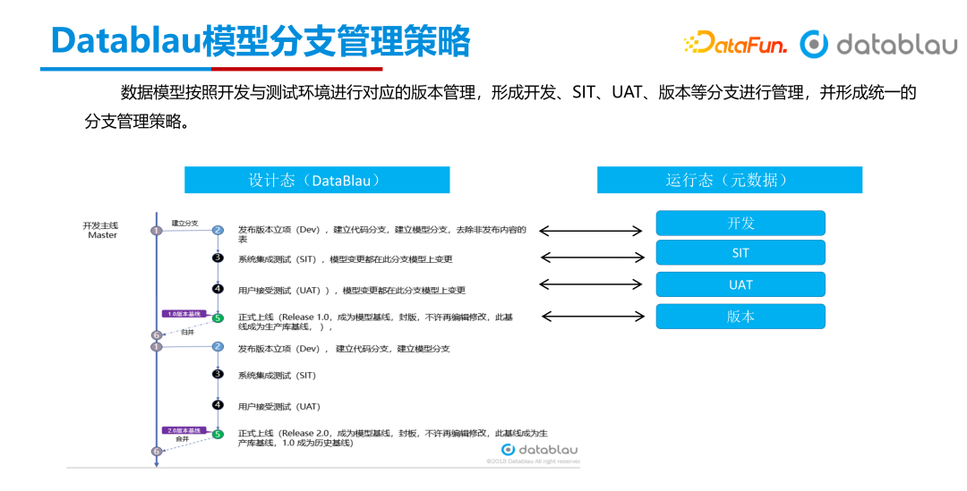 版本分支管理包括设计态和运行态这两部分。数据模型按照开发与测试环境进行对应的版本管理,并基于每个分支的开发、SIT、UAT、版本等不同发布状态进行相应的管理,最终形成统一的分支管理策略。