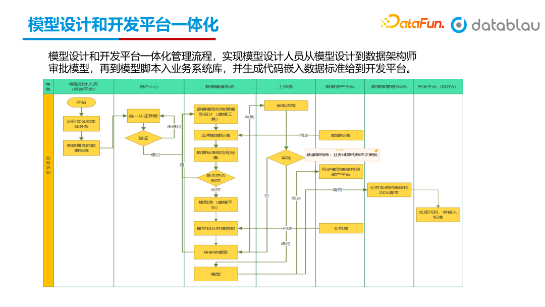 构建模型设计和开发平台一体化管理流程,实现模型设计人员从模型设计到数据架构师审批模型,再到模型脚本入业务系统库,并生成代码嵌入数据标准给到开发平台。