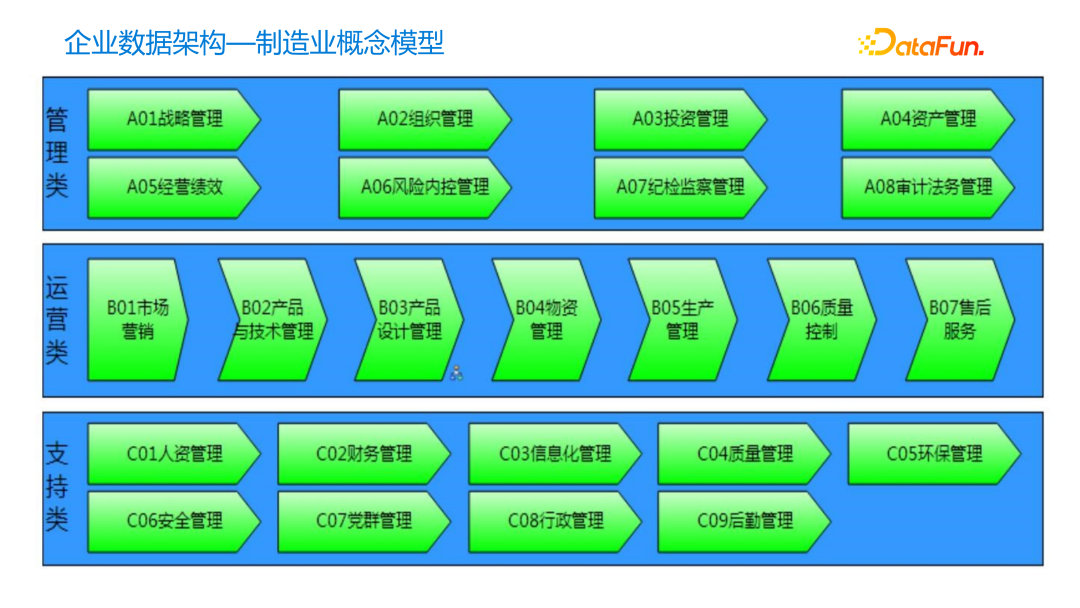 以制造业为例,下图呈现了制造业高阶概念模型,涉及管理类、运营类、支持类等业务板块。