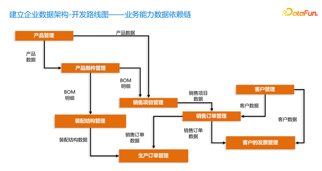 将上述业务板块转化为高阶的主题域模型。以汽车厂为例,首先是进行产品研发,输出产品部品即 BOM 清单;基于 BOM 清单进行装配、生产,并关联销售清单;同时 BOM 也会关联销售项目管理,最终和客户管理、订单管理、销售管理、财务管理等一系列数据进行多重关联,构建出高阶主题域模型。