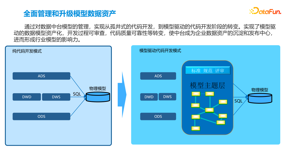 因此,以数据模型为核心,通过对数据中台模型的管理,实现从孤井式的代码开发,到模型驱动的代码开发阶段的转变。实现了模型驱动的数据模型资产化,开发过程可审查,代码质量可靠性等转变,使中台成为企业数据资产的沉淀和发布中心,进而形成行业模型的影响力。
