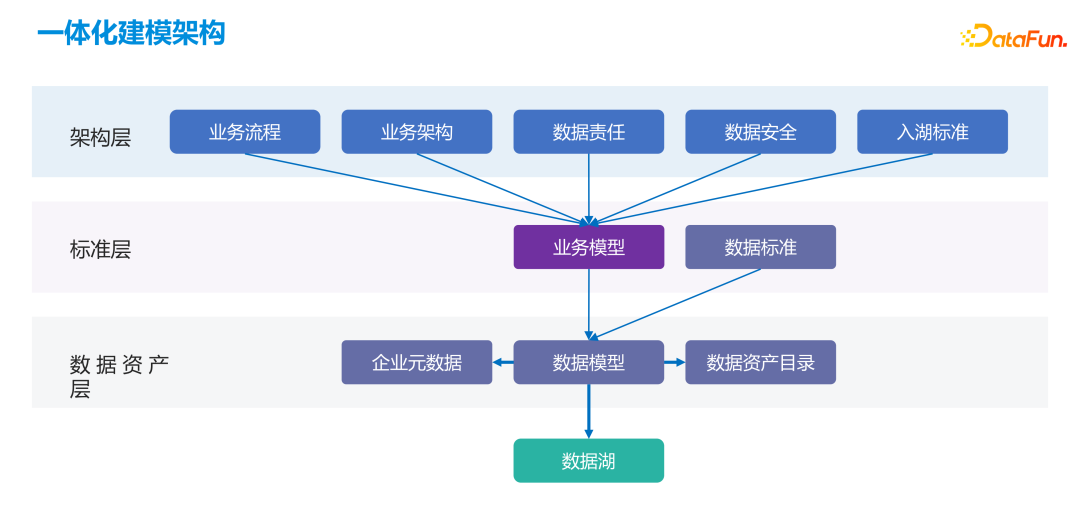 从数据战略角度看,将业务流程、业务架构、数据责任、数据安全和入户标准等相关模块都承载到业务模型上;进一步,业务模型通过数据模型落地实现,结合相应的企业标准进行模型评审,评审通过的数据模型发布成数据资产目录,并最终进入数据湖。