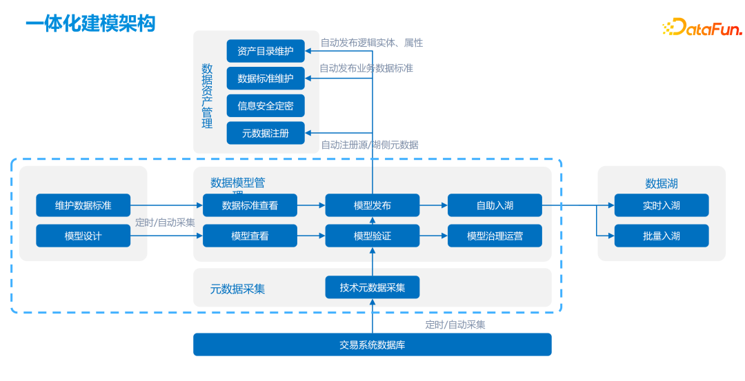 由于数据模型存在迭代更新的周期性,因此在模型设计的过程中,数据标准的维护至关重要。所有的模型都是由数据标准组装而来;模型评审和模型发布作为重要的中间管控节点,最终实现自助入湖,并周期性地和生产元数据做比对。