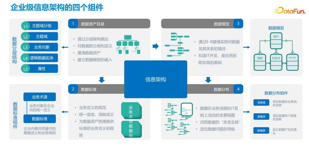 企业级信息架构,本质上是基于一套核心的信息架构,展现成数据资产目录、数据标准、数据模型、数据分布 4 种不同的形式: