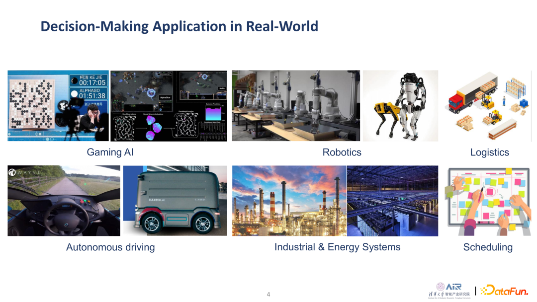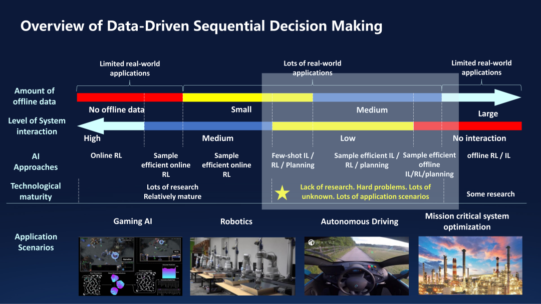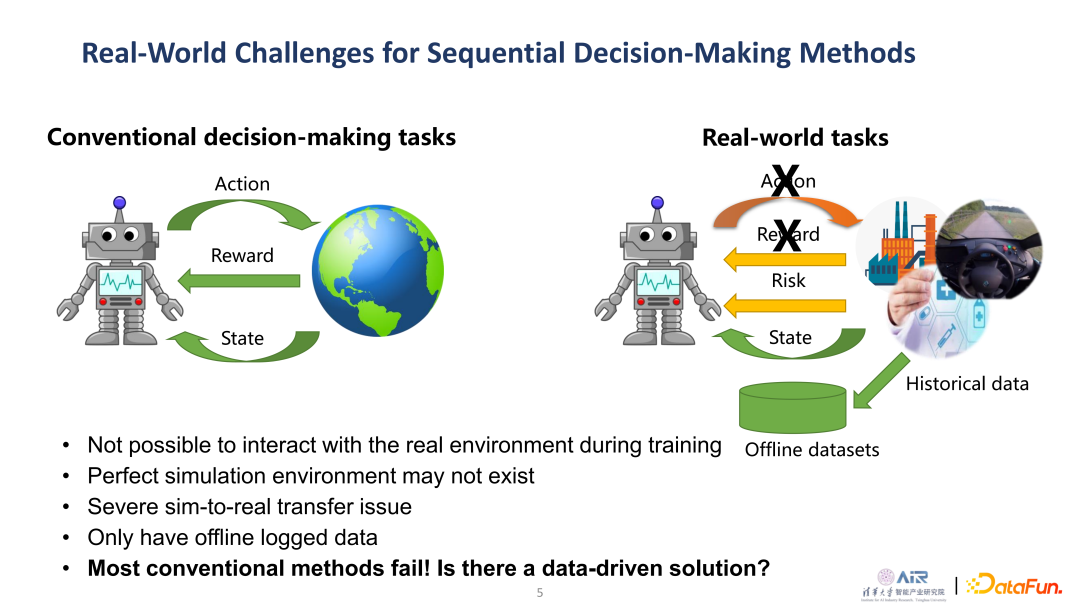 但其实在把强化学习这些方法落地的时候,我们也遇到越来越多的问题。比如经典的决策优化任务的设定,就是根据当前系统观测到的状态,去做某个动作;然后根据反馈的奖励再去做长期的优化。但在真实世界里,如果我们去应用的话,首先在训练阶段,很难跟系统做交互,因为没有训练好的策略可能会给出不好的动作,有可能对真实的工业系统或者自动驾驶的驾驶行为造成灾难性的影响;二是奖励函数也很难设计,又无法与系统做交互,因此也无法评价策略的好坏;另外,在真实场景中也有大量的安全约束,不仅需要做优化,也需要最小化这个风险。但另外一方面,很多真实系统里是有一些数据的,当然这个数据有好有坏,有的数据可能非常单一,可能对决策空间的覆盖非常不完备。但很多情况下,我们还是有一些可用数据的。所以我们现在可能想问,是不是可以有一些数据驱动的方法来比较好地解决这些问题?但是这个领域现在还处在快速发展的探索阶段,我们可以看到越来越多新的方法出现,但现在并没有一个 one solution for all 的算法。