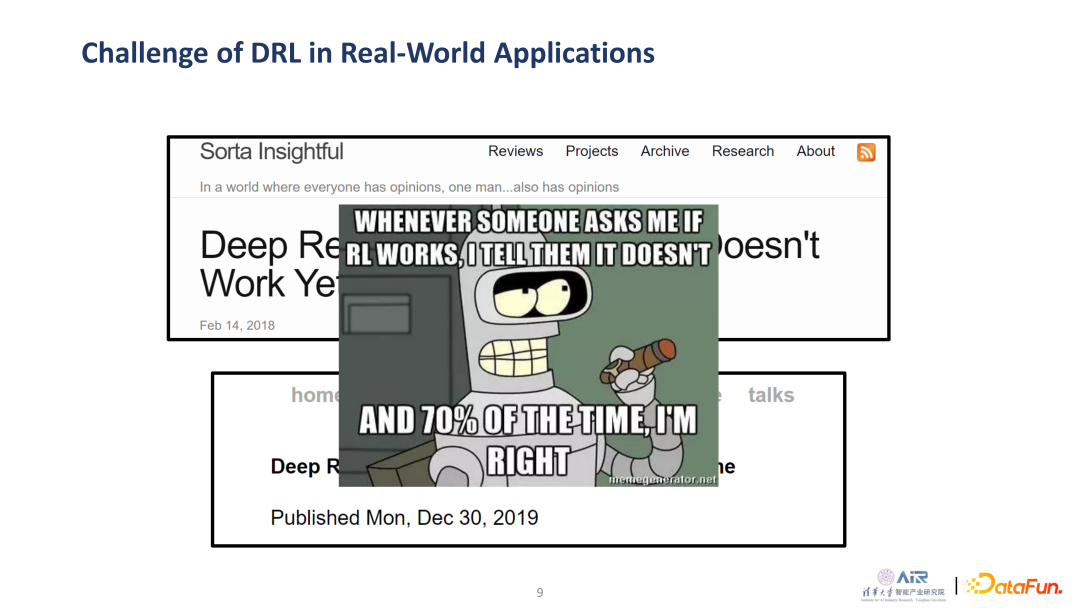 大概 2018 年、2019 年开始,在强化学习的交流中就出现了一些比较悲观的声音。比如,深度强化学习没有作用;或者说这里面存在各种各样问题,就是浪费时间;甚至有人就开玩笑说 70% 的场景无效。