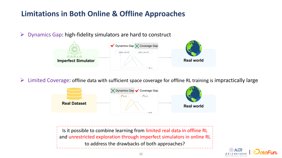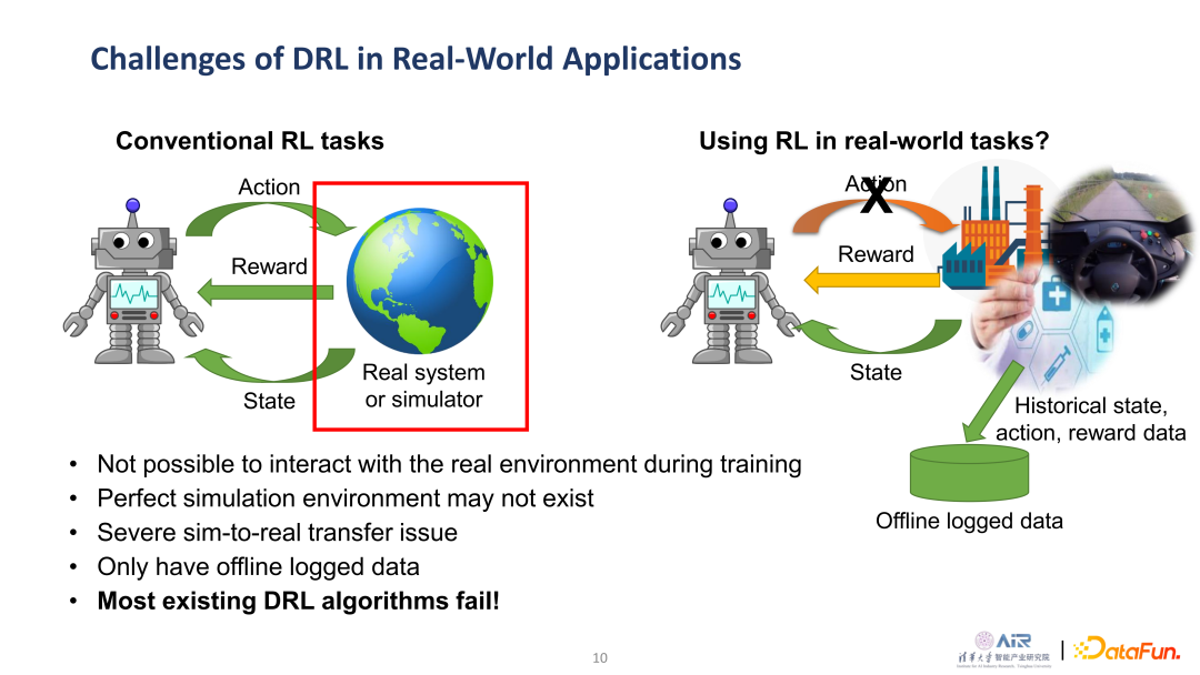 一般强化学习中普遍假设有一个完美的系统可以无限制交互,或者我们有一个完美的仿真环境。但现实是这样一个完美的仿真环境可能建不出来或者代价太大。比如,很多复杂的系统里会存在一些过于复杂的地方,我们都没有理解清楚:一方面,这些系统里可能有一些不可观测量,我们没法准确地复现或者观测;但如果用一个不完美的仿真去直接强化的话,你会发现它存在严重的仿真到现实的偏差,导致我们在仿真环境里训练得很好的策略无法迁移到真实场景里。这就带来一系列的挑战。