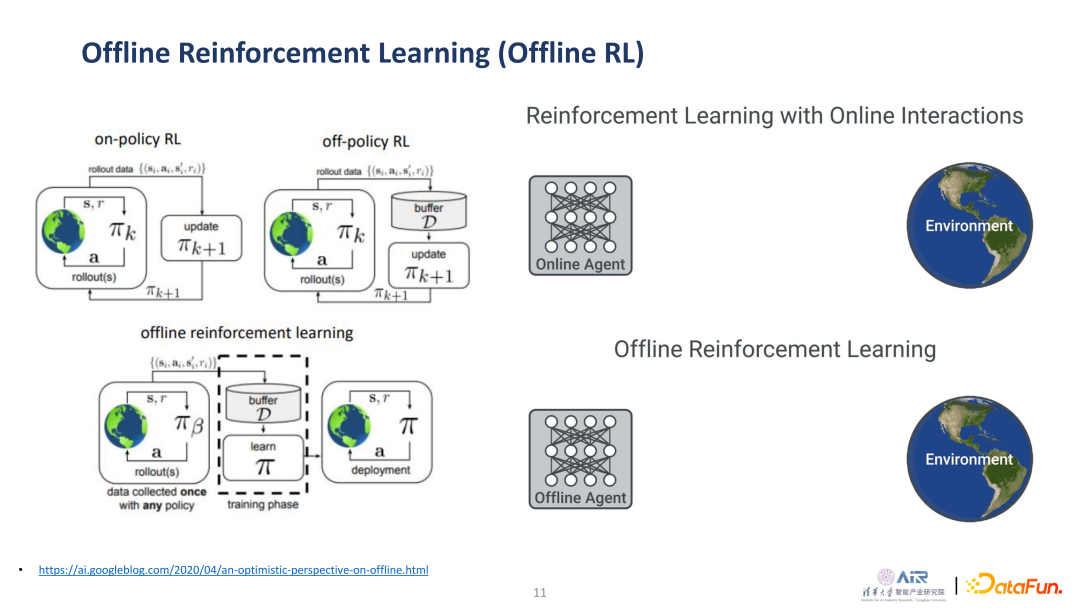 离线强化学习其实就是把仿真的交互环节给去掉,直接通过数据去做强化,但这里面也有一些问题:首先是它跟现有的试错学习(Trial-and-error)的强化学习范式非常不一样,基本上在离线强化的场景里,我们可能有一些数据,这些数据是由一些未知的策略(一般是行为策略)产生的。这里面可能有一个(或多个)数据分布非常狭窄的行为策略产生,或者是覆盖非常稀疏的数据。我们需要从这些数据里训练出一个策略,再部署回去。表面上看,它可能跟 Off-Policy 强化学习方式比较像,因为它有一个 Buffer。但实际我们后来发现,就是用这种 Off-Policy RL 的算法去解 Offline RL 的问题,是不太可行的。这个在后面会详细介绍。