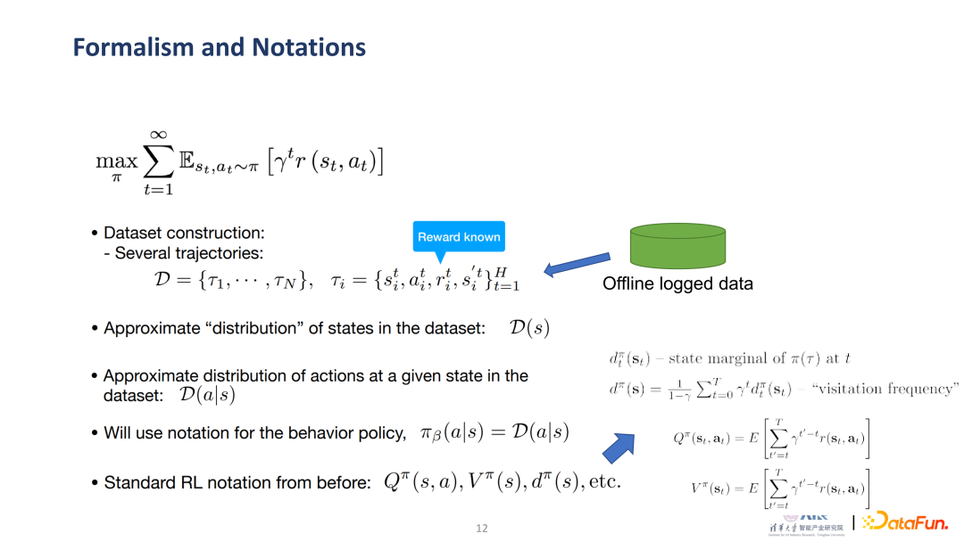 首先,我们介绍 formal definition。其实,离线强化的 definition 和在线强化的基本上一样,唯一的区别就是环境交互换成了静态的数据集 D,它可能有一些预先设计好的轨迹。我们可能有一些生成这个数据的行为策略,一般设为 πβ。另外,还有动作价值函数、状态价值函数和边际状态分布。这些部分与一般 RL 中的定义一致。