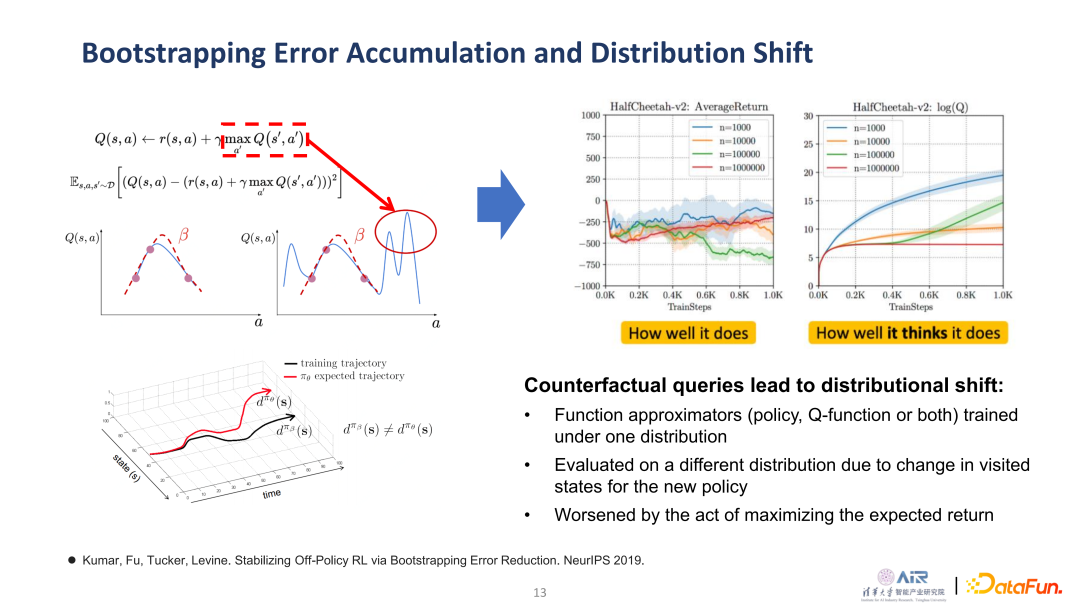 Off-PolicyRL 算法在离线场景里跑,就会发现跑出来的 policy 效果非常差,但是它估计出来的 Q 值非常高,也就是过分乐观地去做一些价值的估计,背后的本质原因就是在后面做了一些反事实推理,在我们不知道的地方,运用错误的推理得到的信息进一步做优化,所以就会把这个事情越搞越糟。