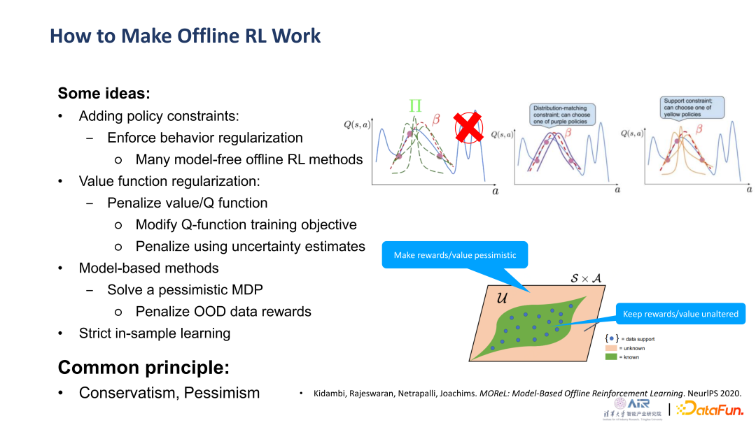 所以,Offline RL 是怎么工作的呢?第一个非常直接的方法,就是通过在策略上加约束的方式去实现,比如 policy constraints 的方法。这类方法其实想法很简单,既然这个价值估值,在这个数据集以外的 Out-Of-Distribution (OOD) data 区域里面会出问题,那么就让它不要去这个地方。这里的约束方法有很多种,比如说可以用显式或隐式的方法去约束策略和数据的分布差异,也可以去限制它的在数据支撑集的差异。另外一个思路其实就是对价值或者奖励去做正则化,比如图中蓝色的点就是数据中的样本点,绿色就是已知可靠的区域,我们尽量保证这个绿色区域里的一些奖励或者价值不要变,但是在对这个未知的地方去做奖励或价值上的正则化或者惩罚。这样的话,我们在做 policy maximization 的时候,就会避免去这个地方。现在比较多的 model-based 的方法以及 model-free 的方法都在用这一套思路。或者是在这个 reward 上加一个基于 uncertainty 的惩罚项,这个 uncertainty measure 或者是从多个 model 里面估计出来的,或者是多个 Q 网络的 ensemble 里面估计出来的,或者就干脆把这个价值函数的训练目标改成让它可以最小化未知区域的 q 值、最大化数据集里的 q 值,从而实现价值函数正则化。最近还有一些比较新也是比较有效的方法,就是我们做严格的样本内学习(in-sample learning),就比如目前引起较大关注的IQL (implicit Q-learning) 方法,我们尽量的是把价值函数完全用数据集里的数据去做学习,但是我就学习比数据里面的价值函数更好的价值函数,然后再去做 policy maximization。
