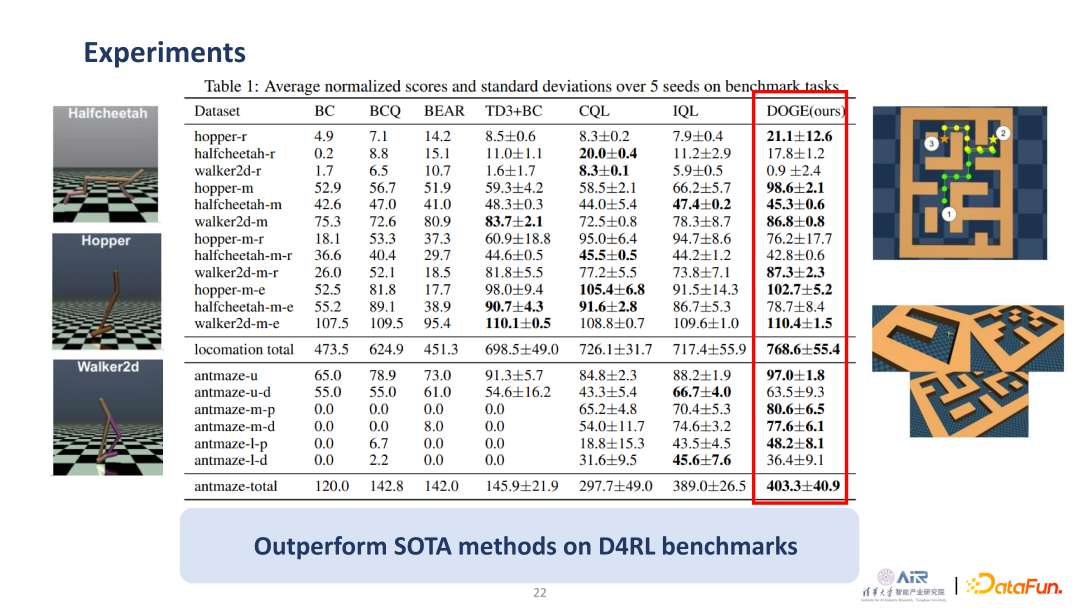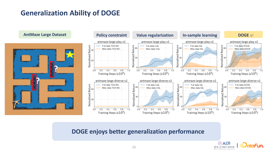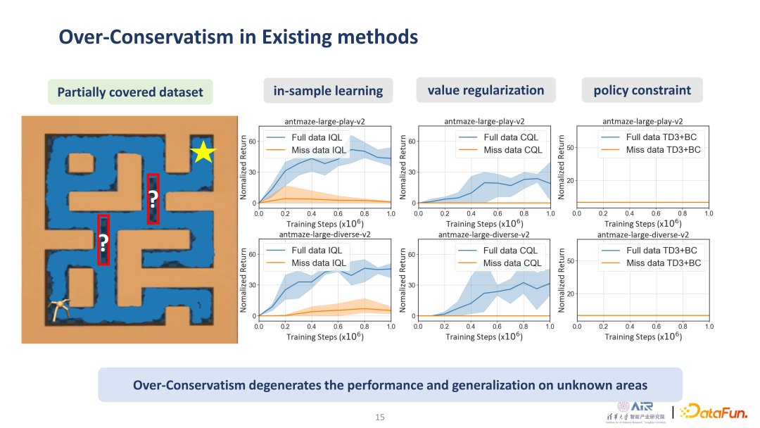 但所有的这个方法有一个共有的准则,都是非常保守、非常悲观的;这样的方法在实际运用中,就会出现各种各样的问题。比如迷宫实验里,蓝色的线就是轨迹覆盖的区域,我们只要把这个数据集扣掉两个很小的区域,就会发现现在主流的一些 Offline 方法的性能基本全都掉到底,基本上都学不起来。这里其实就说明现在所有的方法其实都过于保守了,对数据集的要求非常高。如果数据覆盖得不够好,或者数据覆盖得非常狭窄,这个时候如果过度得做 OOD 约束,就会影响性能。