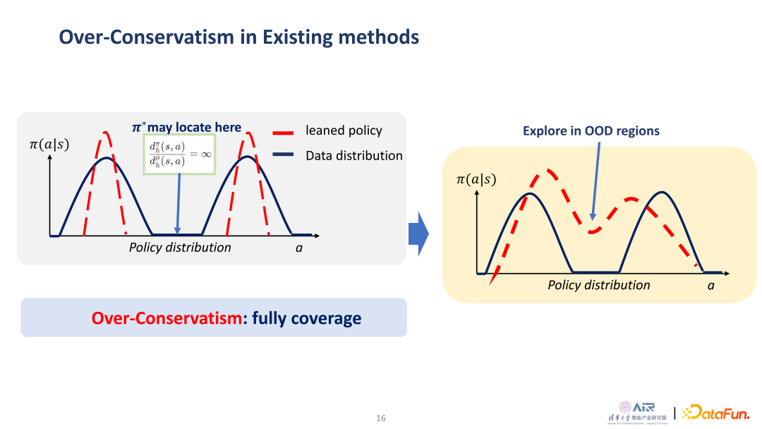 包括现在很多 Offline RL 里面的一些 performance guarantee(性能保证),背后根本性的假设就是有数据全覆盖的前提。即策略衍生出的分布是可以被数据集里的分布包含的。这样的话,优化就只在这里面做,好处是可以有各种各样的理论工具供使用,坏处就是非常不现实。因为大部分真实场景采集出来的数据并不能保证是 full coverage,而且因为我们是在做优化问题,即最优的模式未必就在现有的数据里面,它可能在数据的边缘或者在数据以外的区域,所以如果做得太保守,严格地限制 OOD 和 exploitation,有些任务就很难解决。