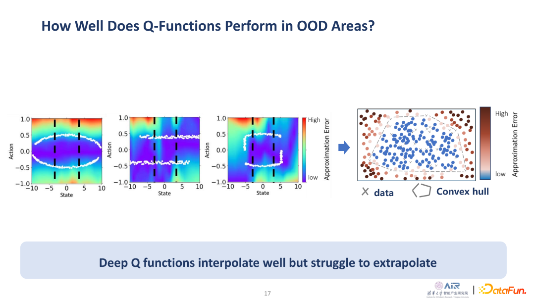 所以如何解决这个问题呢?首先,我们会看一下价值函数,尤其是 Deep Q-Functions 在 OOD 的这些区域到底表现如何?这里可以考虑一个非常简单的一维随机游走任务,就是有一个 Agent 可以在 [-10,10] 这个轴上左右走,到最右边奖励最大,白色点代表离线数据。如果用一个比较经典的方法,比如 TD3,在上面去学习一个价值函数,基于这些数据来估计价值函数的估计误差,就会发现其实在数据凸包内的点,基本上价值估值的偏差不会太远;但当我们去做数据凸包外的外推,它的估计误差可能很大,就算离它很近也是。一般来说,我们称凸包内的点为内插点,凸包外的点为外推点。在这种情况下,我们发现 Q-Function 在用深度神经网络去学习的时候,可以较好地做内差的估计,但是做外推估计的能力很差。