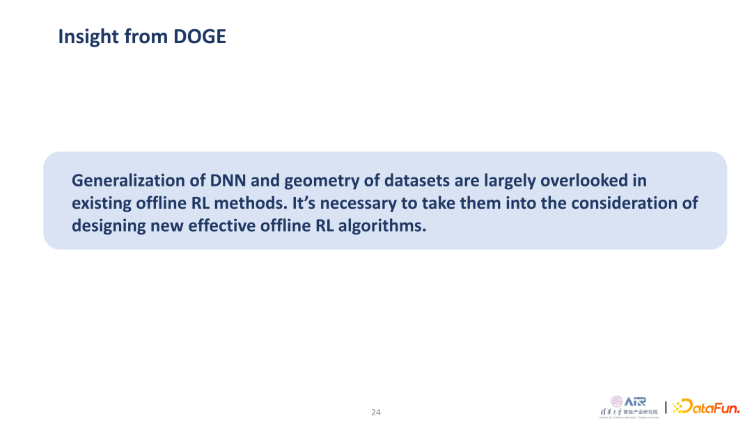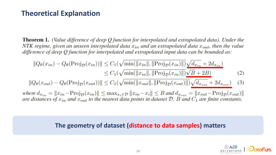 这个性质在很多深度神经网络学习的研究里,尤其是在监督式学习的研究里也被发现了。我们同样也可以证明,这个现象也适用于离线强化学习的范畴。当内差点的价值函数估计的偏差,是可以被这个点到这个数据集里最近的点的价值函数所控制;而且对所有的内差点,都有明确的上界。但是对于外推点而言,就没有明确的上界;即外推点离数据集越远,价值函数的误差可能越大。所以,这也说明,在做 Offline RL 的时候,也要考虑数据集在空间里的 geometry,否则就难以充分利用深度 Q 神经网络的泛化能力。