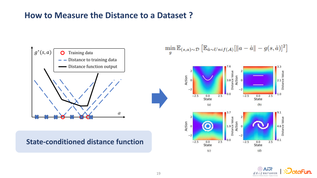 那么,如何把这个想法变成一个算法呢?可以用 State-conditioned distance function 来解决。简单来说,这是用于计算任意一点到整个数据集的平均距离。可以用上图中的监督式学习目标来具体学习,即给定数据集中的每一个点,用数据集里随机采样的动作来计算到当前数据集中动作的距离,再用距离函数进行拟合。