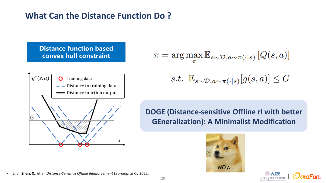 distance function 有一些性质。首先,在这个函数里包络形成的内插点距离都很小,但是外推点距离都很大。而且,对 State-conditioned distance function 的最优解函数对动作求梯度,对所有外推点的梯度方向都指向凸包内部。基于此,可以作为 policy constraint 来指导 policy 学习尽量往数据集的凸包内部走。所以这里我们可以构建一个非常简单的 Offline RL 的算法。可以基于任意的 off-policy Online RL 的框架,在里面加一个基于 State-conditioned distance function 的 policy constraint。公式里的 G 是一个 threshold,可以进行非参数化的调整,比如可以把数据集里所有的距离都跑一遍,再把距离求均值代进去。
