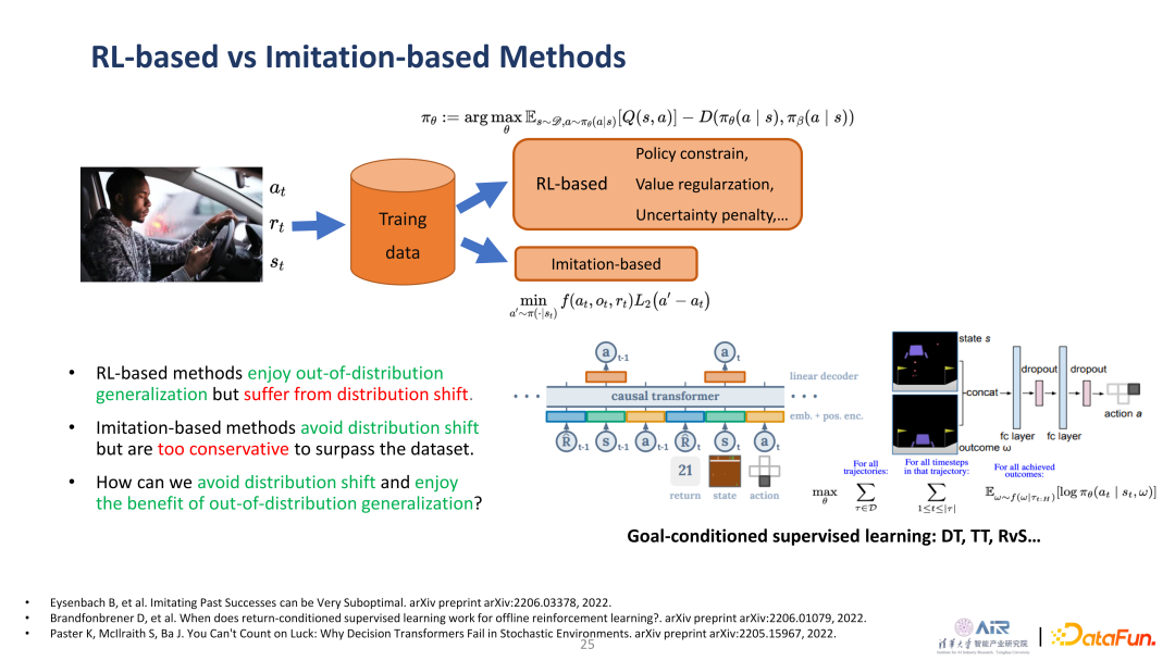 RL 的任务,有一些 IL-Based 的方法也在做这样的任务。但是目前来看,这两种方法各有优劣。比如 RL-Based 的方法,内部其实在做 Dynamic programming(动态规划),所以它其实有可能做 OOD 的泛化。但是它有一个明显的缺点,它会有非常严重的 Distribution shift(分布漂移)的情况,导致训练不稳定。但模仿学习方法的好处是基本上不会有分布漂移的影响,但是因为是模仿,它其实会过于保守,很难超越这个数据集。