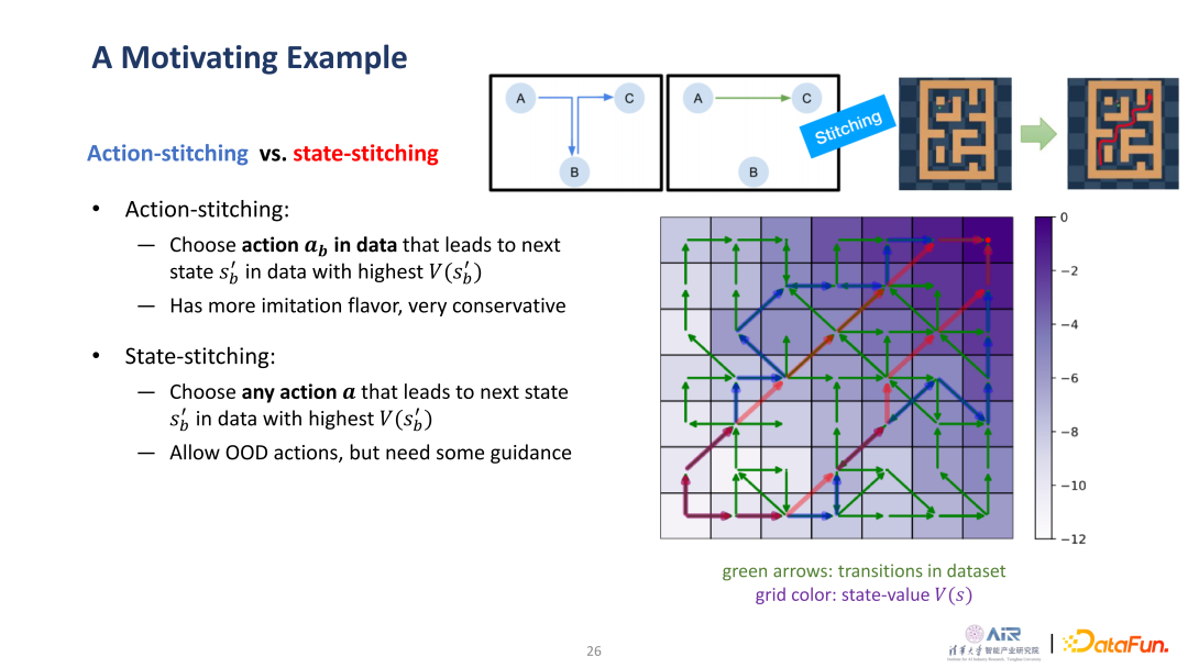 很自然地,我们想提一个问题:就是如何在避免分布漂移的同时又能有一些比较好的 OOD 泛化的性质。所以其实我们可以看一下,就是 Offline RL 里相对比较重要的一个点,就是为什么 Offline RL 在理论上有时候可以超越原始的数据集呢?是因为它可以做数据中的缝补(stitching)。比如,我们的任务是从 A 最快到 C,数据里可能有从 A 到 B 和从 B 到 C 两种轨迹。这个时候我们把它们各自取一半拼在一块儿,就可以找到一个在数据集里不存在、但又更优的策略。其实大部分现有的 Offline RL 方法里,都是在做 Action-stitching。用这个例子来讲一下,就是这个 GridWorld。它的目标是想从最左下的格子最快走到最右上的格子。在每个地方,A 的下一步都可以往周围八个格子里走。绿线就是这些数据里的 transition。Action-stitching 就是每次决定往哪走的时候,采取数据里的 Action;但是走的时候尽量去选那些可以让我转移到下一个状态(即价值比较高)的那个格子,这就叫 Action-stitching。这样一来,这个任务可以解决,但其实并不是最优解。原因是它本质上在做有偏好的模仿,相对保守。但我们更想做状态上的拼接。就比如在任何一个格子里,我们知道它可以去周围八个格子,那么我们从周边格子中选择一个数据集里出现过的价值最高的格子作为下一时刻的状态,这样就能找到一个更优的模式。这在一定程度允许我们去做 OOD 在行为上的应用。但显然也是有风险的,它需要一些引导,也就是这个任务里,我们知道它是可以去周围八个格子的。