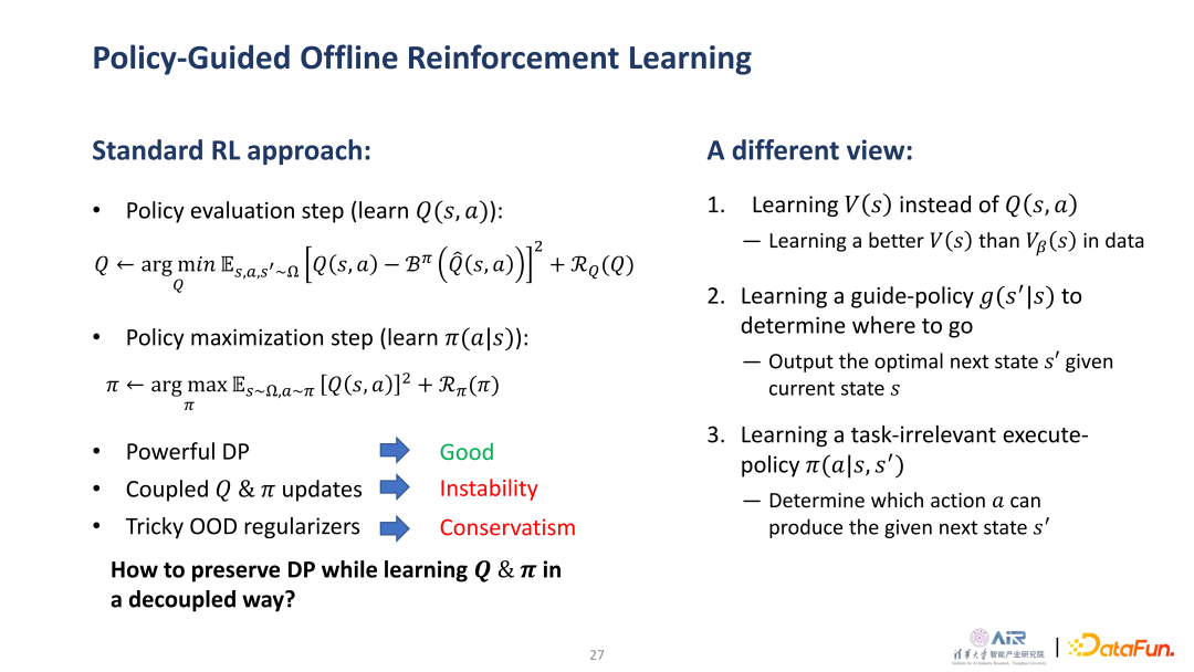 所以如何基于此来构造一个算法呢?目前一般 offline RL 方法基本有两个步骤。第一个就是 policy evaluation(策略评估),即学习价值函数,一般是最小化 Bellman error,再加上一个 OOD 数据上的约束项;第二步就是最大化价值函数学 policy π,但也可能会考虑 policy constraints 的约束,保证其在离线情况下能正常工作。这样有好有坏。好处是我在做 DP,因为有动态规划后,才可能有一些超越数据的性质。但坏处是这里的价值函数和策略是耦合学习的,比如策略没学好,会带坏价值函数;价值函数没学好也会反过来带坏策略函数。这也是 Offline RL 里不稳定的源头。另外,我们还要去设计各种各样的 OOD 的正则项。这其实非常棘手,设计得不好可能约束不住,设计得太狠可能过于保守,会导致性能下降。所以就有一个问题:我们如何能在保留 DP 的同时也能实现 Q 和 π 的解耦式学习。我们可以换个思路来考虑,可以不学这个 Q,可以学这个状态的价值函数 V。因为在学 V 的时候,我们会发现 V 需要的 state 和 state' 都在数据里,而且基本上也不涉及 OOD Action 的问题。但唯一的问题就是怎么在数据里学习到比数据里的 V 更好的 V。这是第一个问题。第二个是如果学 V 的话,怎么做 DP 呢?我们可以学一个不一样的引导策略
