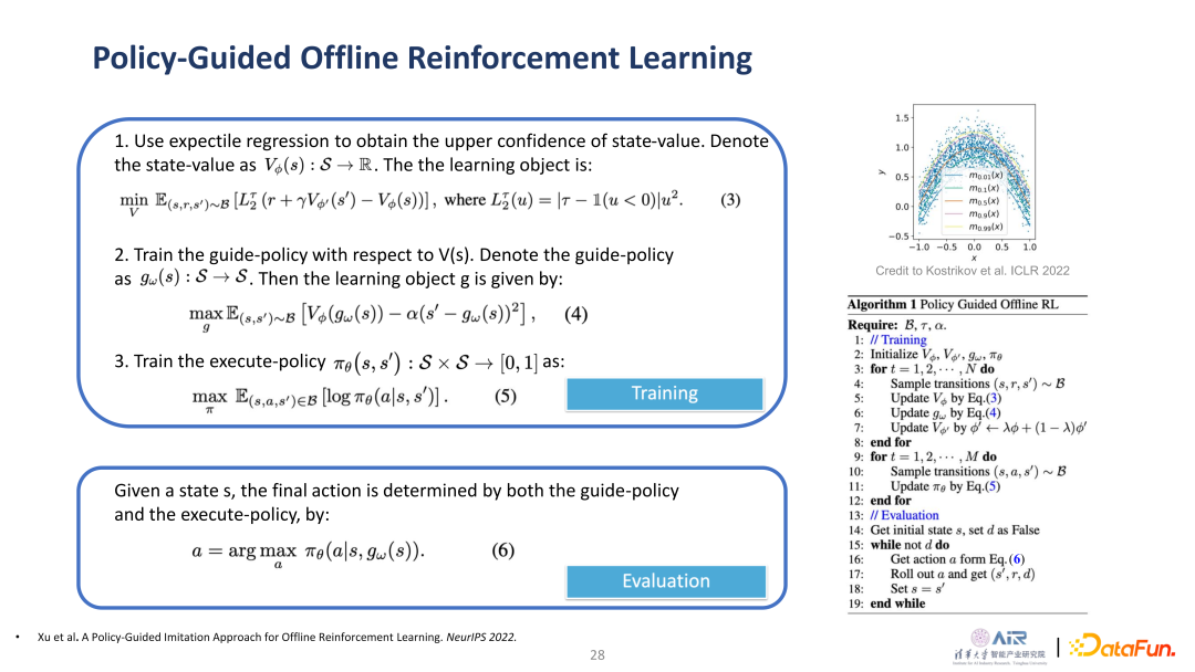 有了这些以后,我们就可以构造一个比较简单的算法,可以完全实现样本内学习。它的主要做法如下:第一,用一个非对称的 expectile regression 去学习比数据里更好的状态价值函数 V,再基于离线数据最大化价值函数去学习引导策略 g。但是因为它是需要一些约束的,所以我们会加一个状态上的 BC(行为克隆)约束。最后执行策略的学习可以采用完全监督式学习的方法,就是从数据里的状态行为和下一个状态用最大似然估计法输出一个执行策略 π,使用的时候就把执行策略学出来的下一时刻的 s' 换成引导策略,就可以去做 Online inference(在线推断)。