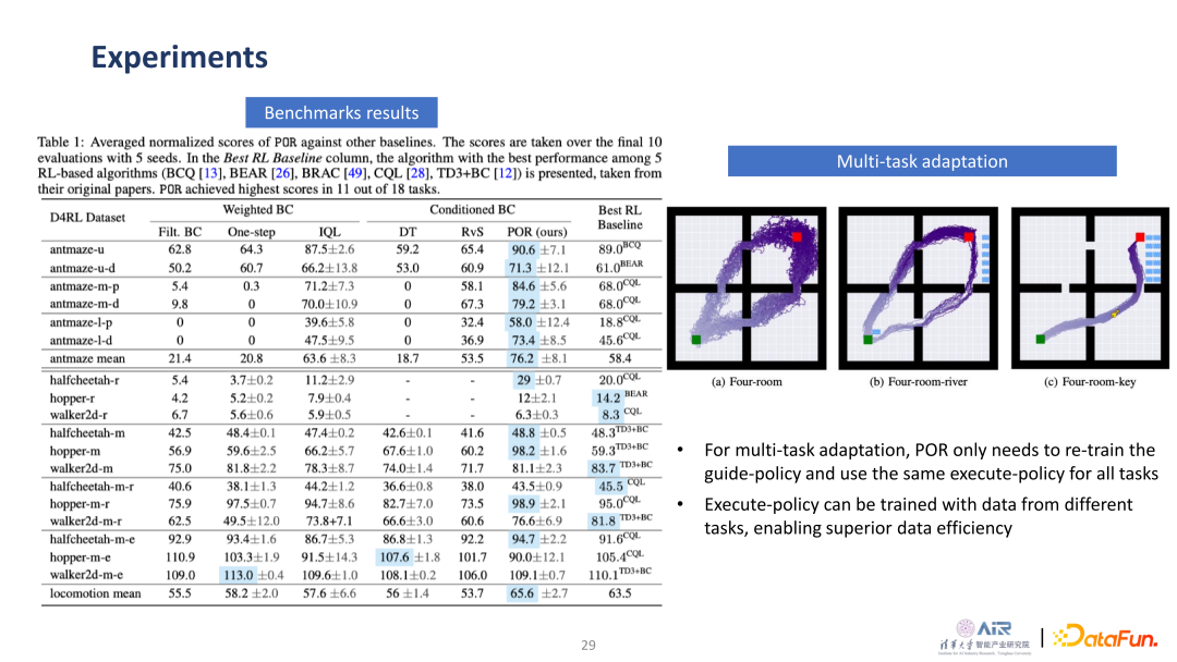 这样的方法可以实现完全的 In-sample learning(样本内学习),至少在训练阶段不会因为分布飘移受到非常大的影响,而且可以训练得非常稳,效果上也非常不错。另外,比较有意思的一点是因为执行策略与任务无关,只和当前的状态和下一个时刻的状态有关。这意味我们可以让它去做任务适配,即不同的任务只需要把引导策略重新学习一下,就可以用同一个执行策略,即可以有效地迁移到不同的任务上。比如右边 four-rooms 的实验,如果我们什么都不加,agent 从左右两边都可以走;但是这个任务加了一条小河,重新调优引导策略,它就会绕着河走;或者在另一个任务里面,比如要捡个钥匙才能进房间,策略也会很快适配上去。