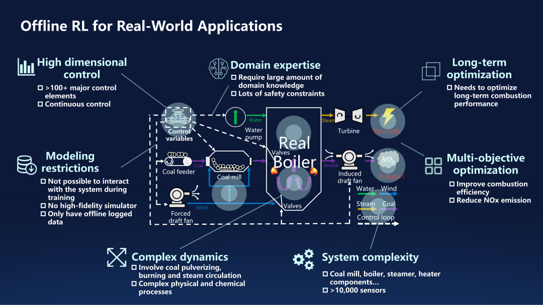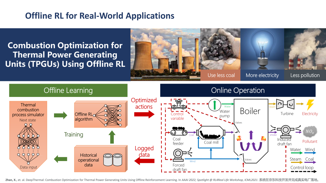 现在已经有 Offline RL 陆续落地的尝试出现了。这是大概两年前我们做的一个工作。我们把离线强化学习用在了一个非常复杂火力发电机组的控制优化上。虽然现在还是一个开环的控制,但基本上已经落地了六、七个电厂。它其实是一个纯粹的离线强化学习框架。我们从真实的火电机组里面采集长期历史运行数据,从数据里学习离线强化学习策略,经过一些离线策略评估后选出来最好的策略,再做部署和测试。