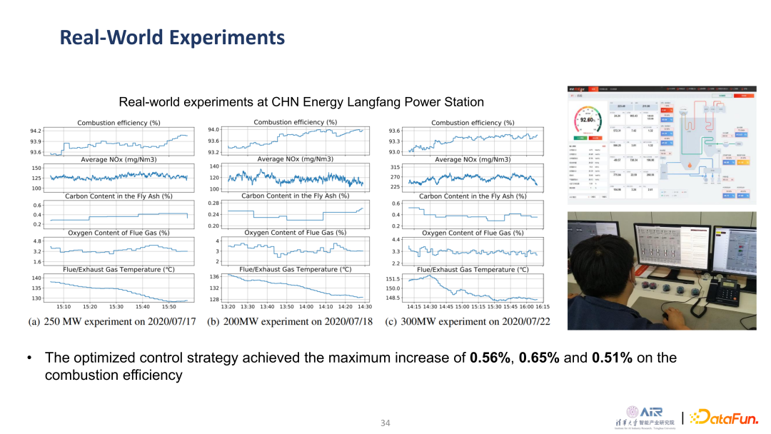 策略训练好了以后,就可以部署在电厂里接入电厂的实时数据。把实时数据收集上来后,根据策略产生优化过的指导策略,把结果告诉电厂的运行人员,让他们再去做调整。我们在不同的机组运行工况下做了一系列实验,基本能实现锅炉的燃烧效率从 92%-93% 提升大概 0.5%。虽然这个值看起来比较小,但是因为现代化的火电机组整体的燃烧效率已经很高了,煤燃烧得比较充分,提升 0.5% 能帮一个电厂省下大概上千吨的煤炭。目前我们也看到,现在 Offline RL 已经有很多的研究陆续出来了,例如一些空调节能或者一些医疗场景。未来可能随着离线强化学习的算法越来越鲁棒,对样本的要求越来越低,可能会有更多的落地实践出来。另外一个比较有意思的工作,就是离线和在线的混合强化学习。