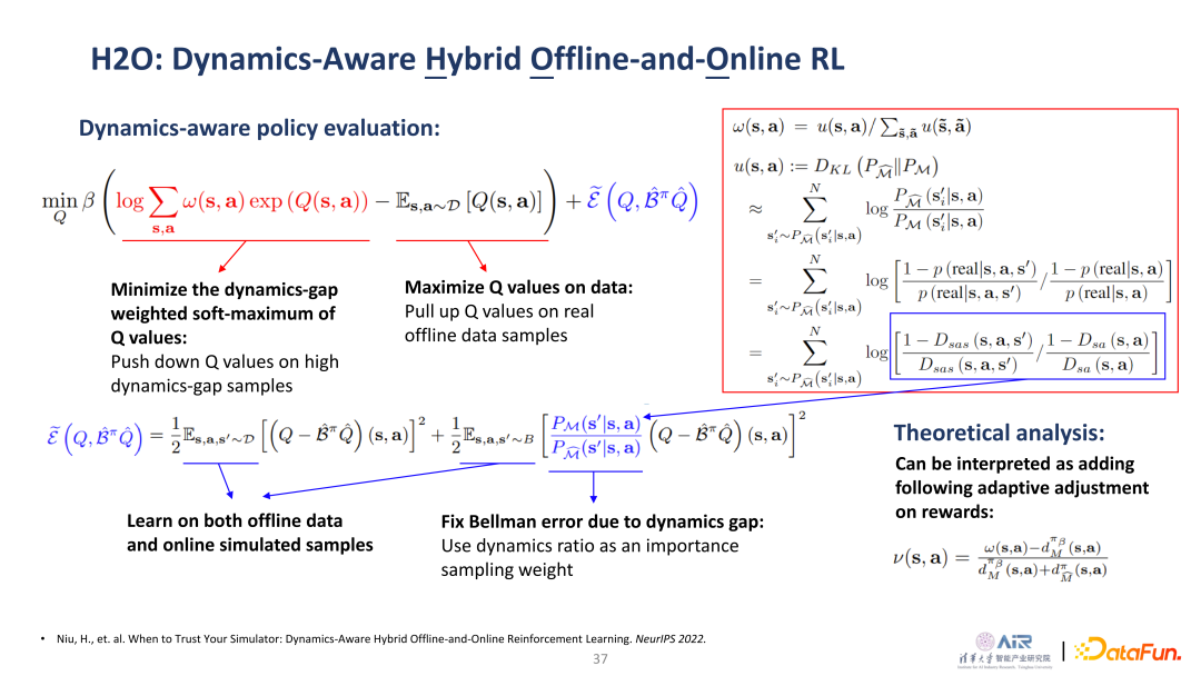 所以我们希望能把这两者结合一下,用真实数据里的动力学关系去修正不完美仿真里的动力学关系,再用不完美仿真里无限制交互带的数据 coverage 去部分弥补数据里面的 coverage gap。所以我们提出了一个新的方法 H2O,核心是 Dynamics-aware policy evaluation。它的形式跟离线强化学习里的 Conservative Q-Learning(CQL)很相似,主要有以下几项:第一项是在学习 Q 的时候,最小化动力学偏差比较大的那些 Q 值。但同时,我们又把数据里的 Q 值往上提。这里面我们把 Dynamics gap 的度量定义成仿真里的动力学状态转移概率函数与真实世界里的转移概率函数的偏差程度。这里可以基于贝叶斯估计的方式推成上图中下面的形式。这意味着我可以学两个判别器,其一 Dsas 是基于当前的状态、动作、下一个时刻的状态去判别该数据是来源于仿真环境还是来源于真实数据;同时还需要另外一个判别器 Dsa,就只是根据数据中的 state 和 action 做判别。然后就可以去估计仿真和真实的状态转移概率的比值(dynamics ratio),由此可以把 Dynamics gap 的偏差估计出来,进而再对价值函数做自适应的加权,就会减少动力学偏差比较大的地方对价值函数学习的影响;另外,这里还有一项修正过的 Bellman error,包含以下两个部分:第一部分是从数据里去做 Bellman error 的最小化,第二部分是从仿真样本里去做 Bellman error 最小化。但是有一个要注意的点,就是仿真里的动力学关系是不准的,所以从当前 state-action 转移到下一个还是有问题的,是需要修正的。我们可以用 importance sampling weight 去修正。这个值其实就是前面 dynamics ratio 的相反数,正好也算过,可以直接用。这个就是它最终的形式。我们可以通过理论分析证明:这样的价值函数策略评估的方式等价于在奖励上加了一个自适应的调整项,这个调整项既跟 Dynamics gap 有关,也跟数据里的状态分布有关。当 Dynamics gap 较大的时候,它通常是作为惩罚项出现;当 Dynamics gap 比较小,并且这里有数据的时候,它是作为一个鼓励项出现,会鼓励在这个有数据地方多做探索。