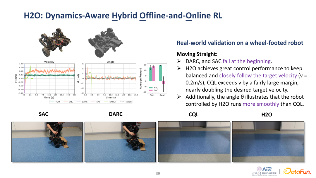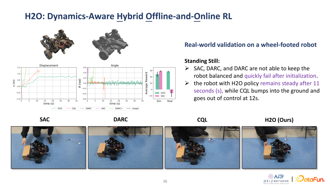 这是我们在真实的轮足机器人上做的一系列实验。这个任务是我们想让这个机器人只靠两个轮子就能站立和行走。这里面我们也建了一个仿真环境,在这个仿真环境里,由于地表的摩擦力很难准确检出,机器人上电机有些背隙(backlash)或者磨损也很难建模出来,所以我们在仿真里学出来的 SAC 策略在现实里面根本就不可迁移。有一些 Cross-domain 的 Online RL 方法例如 DARC,它在上面跑得也不好。离线方法 CQL 基本上可以站起来,但是站不稳,一直往前溜,然后就摔了。那我们的方法就是可以稍微往前溜一点,最后可以稳稳地一直站住。