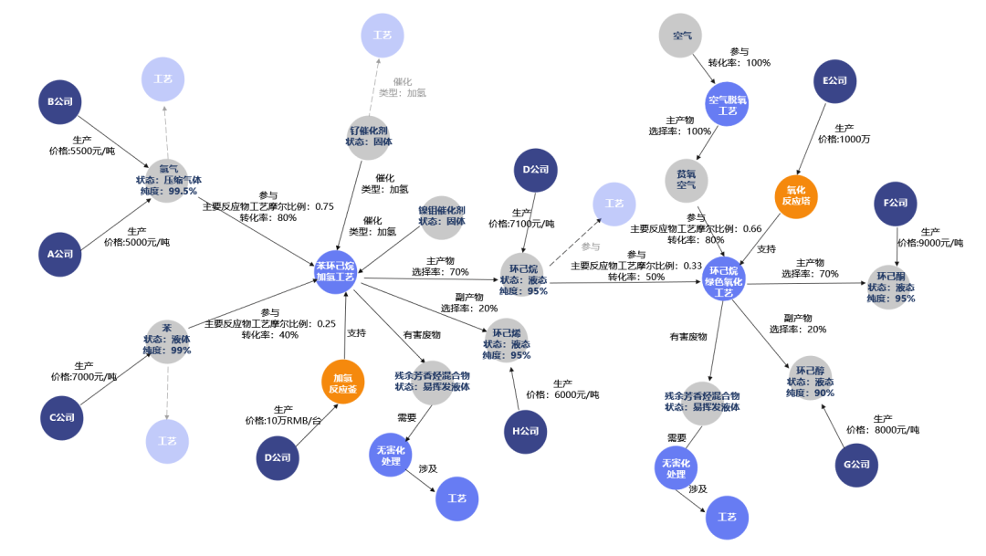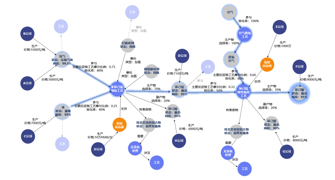 借助图构建工具,可以将公司内用于工艺研发的相关信息要素以图的形式存储和组织。在此基础上,图可视化分析技术就可以通过灵活便捷的交互,强大的查询筛选能力以非常直观与灵活的方式展示工艺路径研发人员希望看到的信息。
