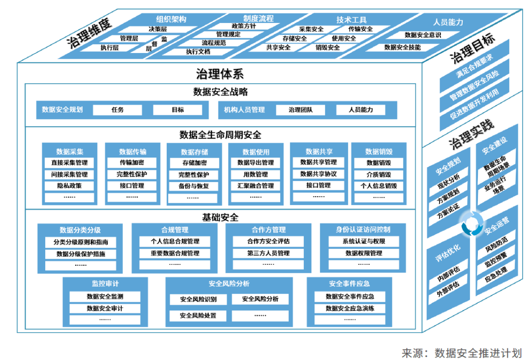 《指南2.0》基于行业发展现状,提炼出“全局体系规划,场景有序落地,运营持续加强,评估助力优化”的数据安全治理实践理念, 并进一步丰富形成“规划—建设—运营—优化”的闭环路线,用以指导各行业组织数 据安全治理工作的落地推进。